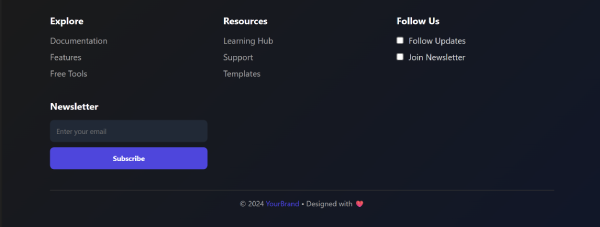 Terakhir, ada pilihan footer dengan tampilan dark mode yang lagi populer. Selain memberikan kesan modern, desain ini juga terasa lebih nyaman di mata, terutama untuk website dengan gaya minimalis dan kekinian.